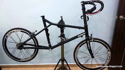 Also note the rear caliper brake which is mounted underneath the chain stays, supposedly for better aerodynamics as compared to being mounted on the seat stays. It is also a direct mount brake, which should give better braking force as compared to the usual type that is mounted with the centre bolt. One major disadvantage of being mounted underneath is the difficulty of servicing the brakes. Most of the time, it is necessary to remove the crankset or chain rings to make adjustments to the brake, as the chain rings will block access to the brake.