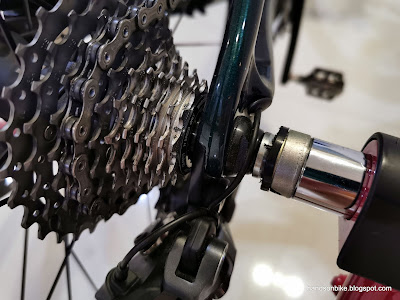 However, many new bikes that use disc brakes come with 12 mm thru axles, as already seen on the Canyon Endurace and also the Cervelo Aspero. It is not feasible to attach the thru axle directly to the Minoura bike trainer, as the interface shape is different and will not be able to hold the bike firmly and safely.
