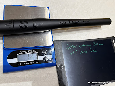 I used a very general formula to calculate the ideal handlebar width. Based on this guide, the handlebar width should be about 0.44 of the rider's height. This gives a handlebar width of 520 mm. The weight is pretty OK but there are lighter ones available. The one I used on the Birdy is just 107 grams for 580 mm width. Not sure why this one is significantly heavier, probably because I got a cheaper one.